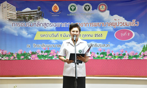 วันที่ 9 ตุลาคม 2563 (เวลา 08.30 - 10.30 น.) ดร.ปัทมา ผ่องศิริ ผู้อำนวยการวิทยาลัยพยาบาลบรมราชชนนี สรรพสิทธิประสงค์ ได้เป็นประธานในพิธีปิดการอบรม "หลักสูตรการพยาบาลเฉพาะทาง สาขาการพยาบาลผู้ป่วยมะเร็ง รุ่นที่ 2" ณ ห้องประชุมสัตตอุบล (1103) อาคารเรียน 1 วิทยาลัยพยาบาลบรมราชชนนี สรรพสิทธิประสงค์