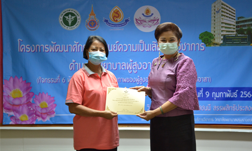 วันที่ 10 กุมภาพันธ์ 2564 (เวลา 08.30 - 16.30 น.) วิทยาลัยพยาบาลบรมราชชนนี สรรพสิทธิประสงค์ ฝ่ายวิจัยและบริการวิชาการ ได้จัดโครงการ พัฒนาศักยภาพศูนย์ความเป็นเลิศทางวิชาการด้านการพยาบาลผู้สูงอายุ "กิจกรรมที่ 6 พัฒนาครูต้นแบบด้านสุขภาพของผู้สูงอายุสู่การเป็นวิทยากรจิตอาสา" โดยมีวัตถุประสงค์ เพื่อพัฒนาความรู้ด้านผู้สูงอายุที่เป็นปัจจุบันและทันสมัย เพิ่มพูนความรู้ และทักษะชีวิตที่จำเป็น ขณะเดียวกันก็เป็นพื้นที่แลกเปลี่ยนเรียนรู้ให้ผู้สูงอายุได้แสดงศักยภาพ ผ่านการถ่ายทอดความรู้อย่างเป็นระบบ เกิดทักษะด้านการดูแลตัวเองและพึ่งพาตัวเองได้ สามารถเป็นครูต้นแบบในการดูแลสุขภาพให้ผู้สูงอายุ ทั้งบุคลากรภายในและภายนอกอย่างต่อเนื่อง โอกาสนี้ ดร.ปัทมา ผ่องศิริ ผู้อำนวยการวิทยาลัยฯ เป็นประธานในพิธีเปิดโครงการฯ และพิธีมอบใบประกาศนียบัตร ให้แก่ผู้เข้าอบรมในโครงการฯ ณ ห้องประชุมสัตตอุบล (1103) วิทยาลัยพยาบาลบรมราชชนนี สรรพสิทธิประสงค์